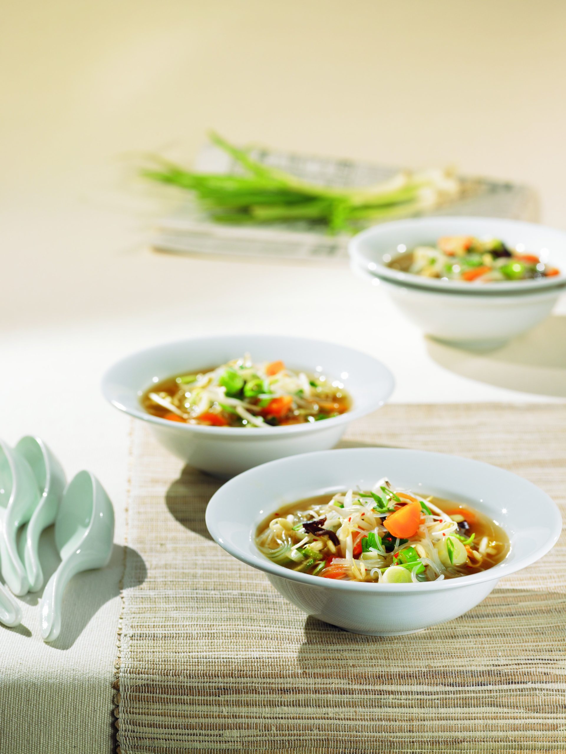 - Polévku okořeníme sójovou omáčkou a čerstvým koriandrem. Následně do polévky vmícháme skleněné nudle Vermicelli a necháme 4-5 minut nasáknout polévku.