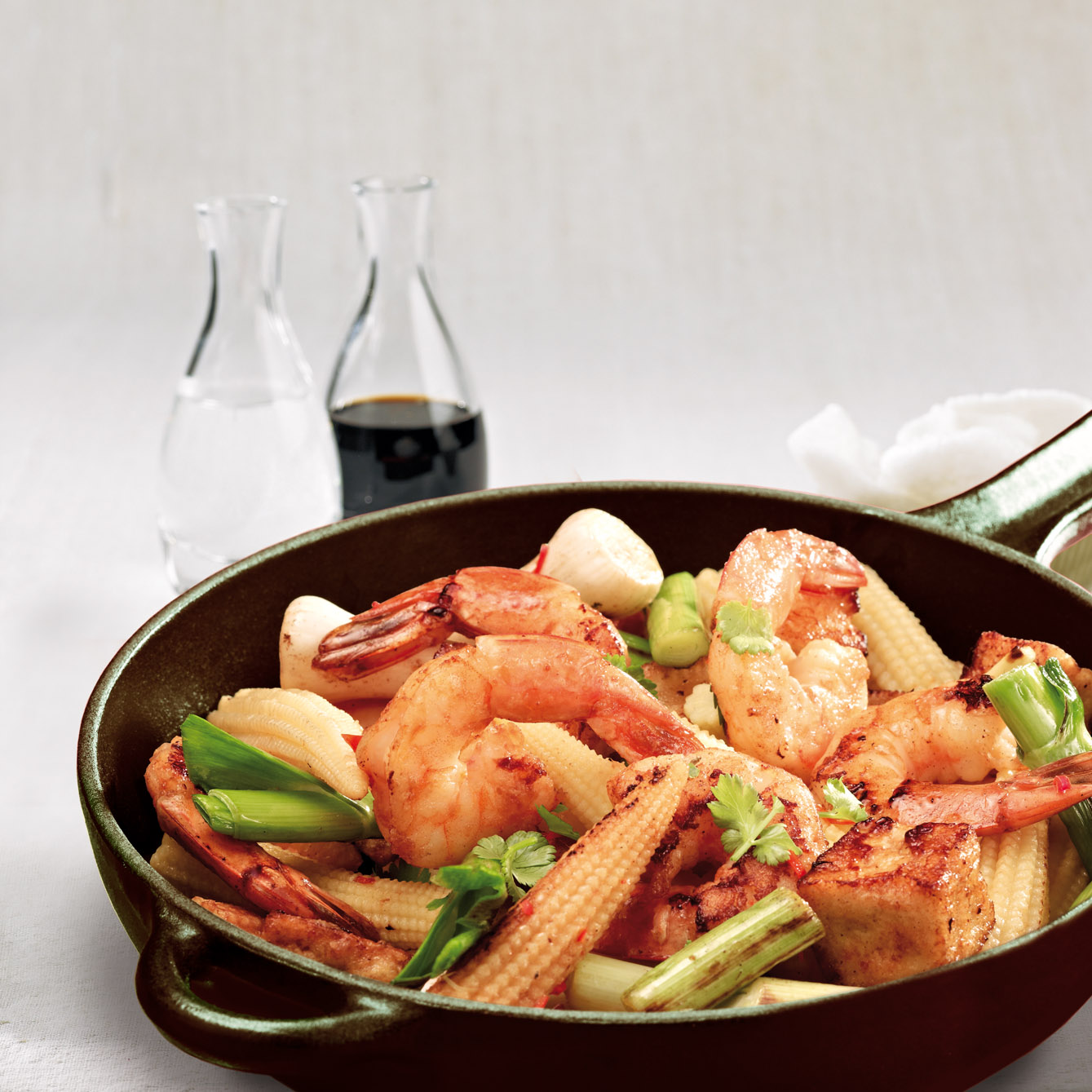 - Arašídový olej rozpálíme ve woku a krevety prudce smažíme 7-10 minut.